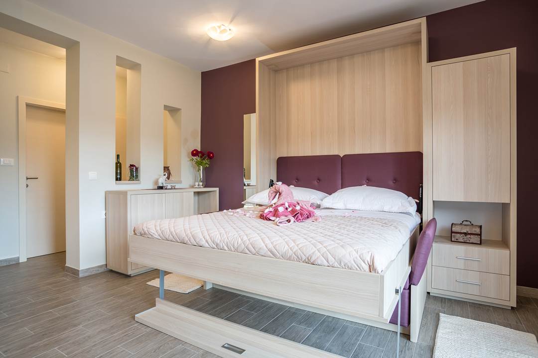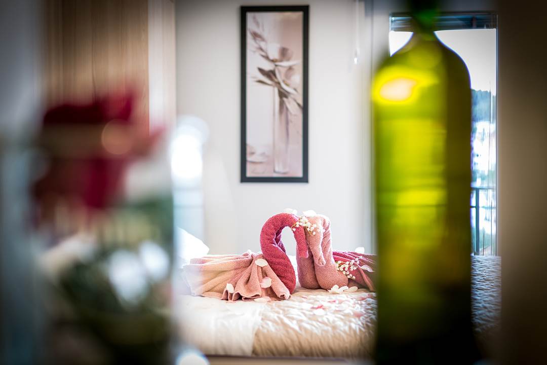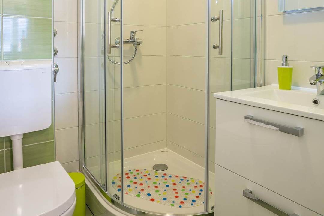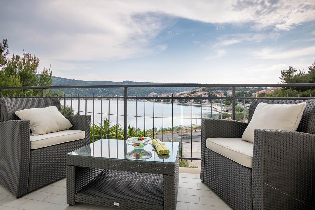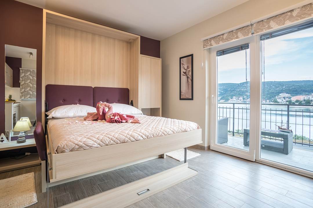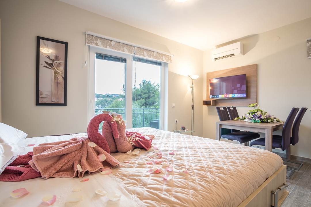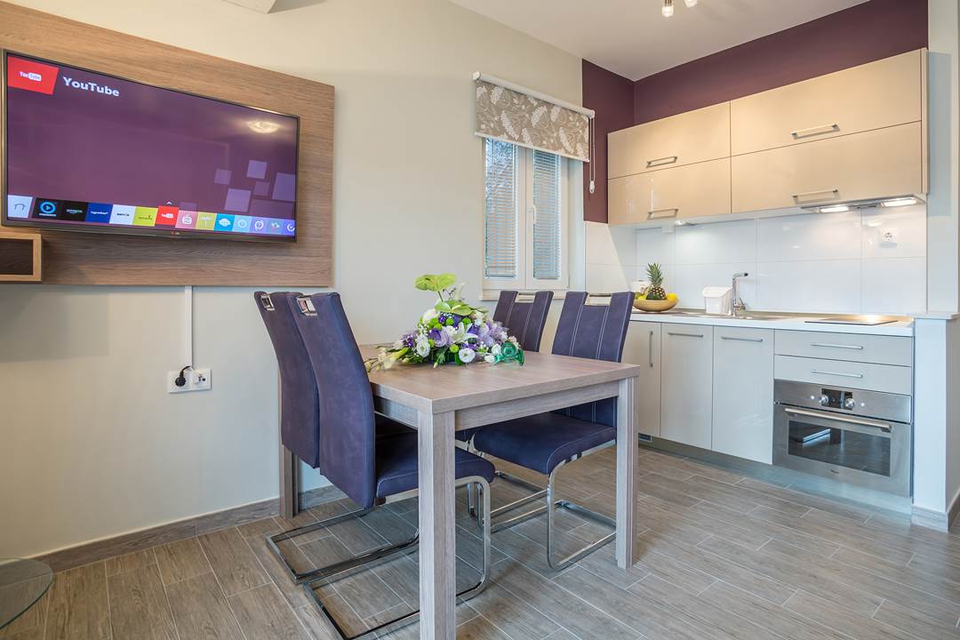 House has in total 450 square meters with 450 square meters around the house. Apartment has toillete, one room, with two additional beds in living room. There is possibility of an extra baby bed. Every apartment has a coffie machine, hair dryer, microwawe oven. A refrigerator is also provided. Towels and bed linen are featured. House has it’s own parking with video surveillance.